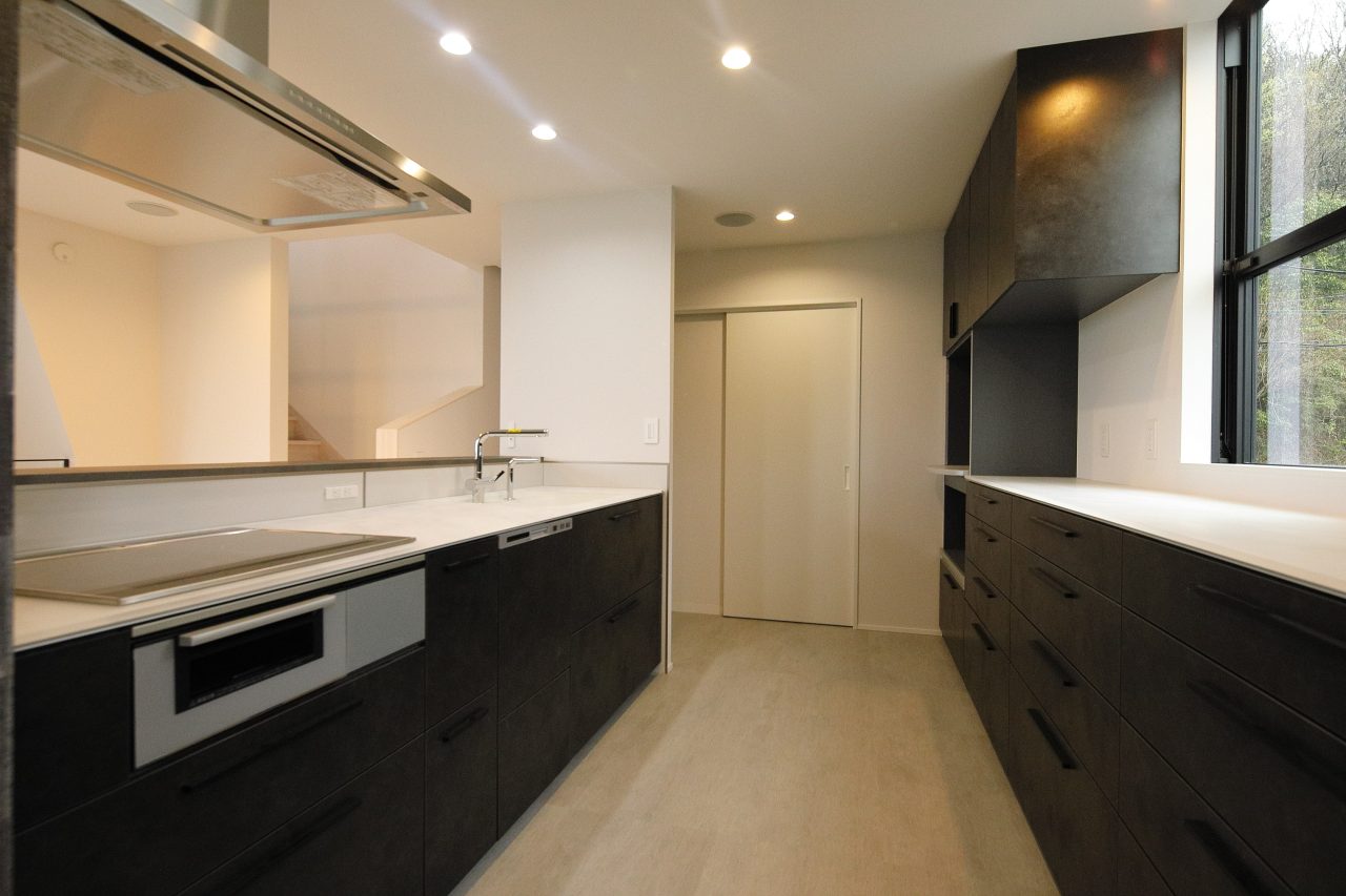 洗面は黒を基調としたホテル仕様に。脱衣とタオル収納もたっぷり確保し、生活感が出すぎないように見えない収納にしています。キッチンやリビングから短い動線で行き来することができます。