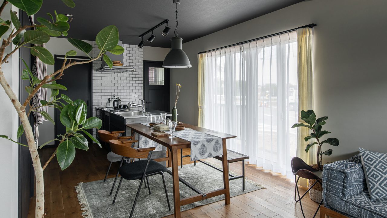 ブラックの吹き抜け階段は空間のアクセントとなり、リビングに立体的な広がりを生み出しています。ダイニングとキッチンを横並びに配置することで、家族の動線もスムーズに。