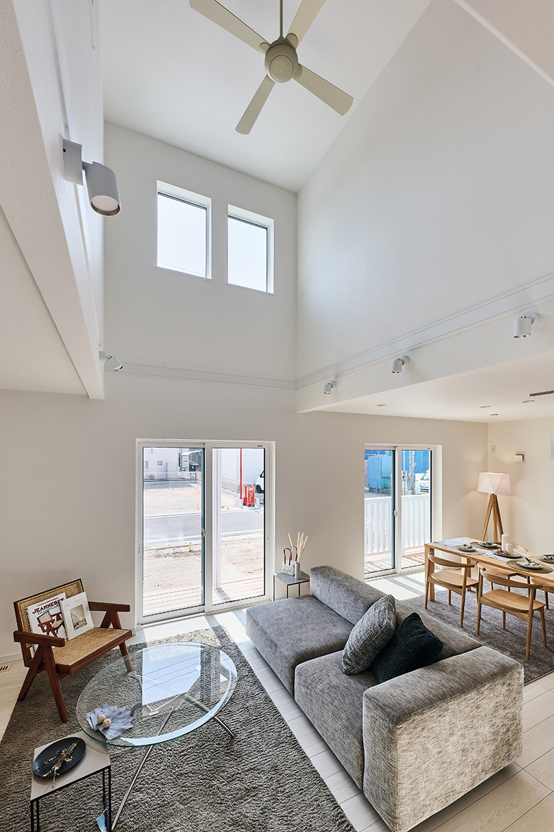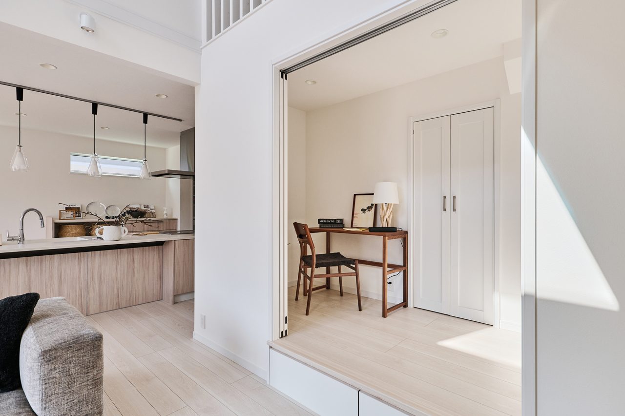 フルフラットキッチンを採用したLDKは、視線がすっきりと抜ける開放的な空間。玄関ホールや水まわりへとつながる回遊動線が、快適な暮らしをサポートします。リビング横には床を一段上げたヌックを設け、天井を少し抑えることで落ち着いた居心地に。吹き抜けのリビングとの高低差が、空間にリズムと奥行きを生み出しています。