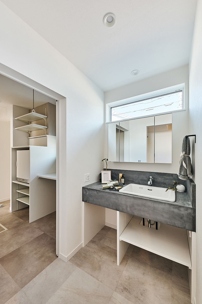 外観は直線的でスタイリッシュに、内観は奥様の好きなホワイトとグレーベージュを基調にした、ラグジュアリーで落ち着きのある空間に仕上げました。